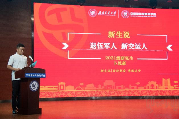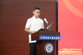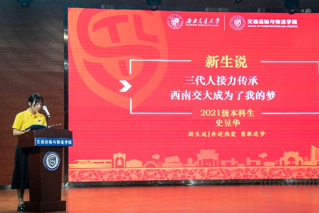 史昱华,2021级本科新生,与铁路有着“三代情缘”。她的爷爷和父母都从事铁路相关的工作,从小被耳濡目染的她也想做一个像爷爷那样忠诚的铁路人。她相信在座的各位都和她一样,抱着一颗赤诚之心来到交大,不论各位是否了解铁路,每个人都是自己的“铁一代”,都有机会在交通发展史册上书写独属于自己的璀璨人生。