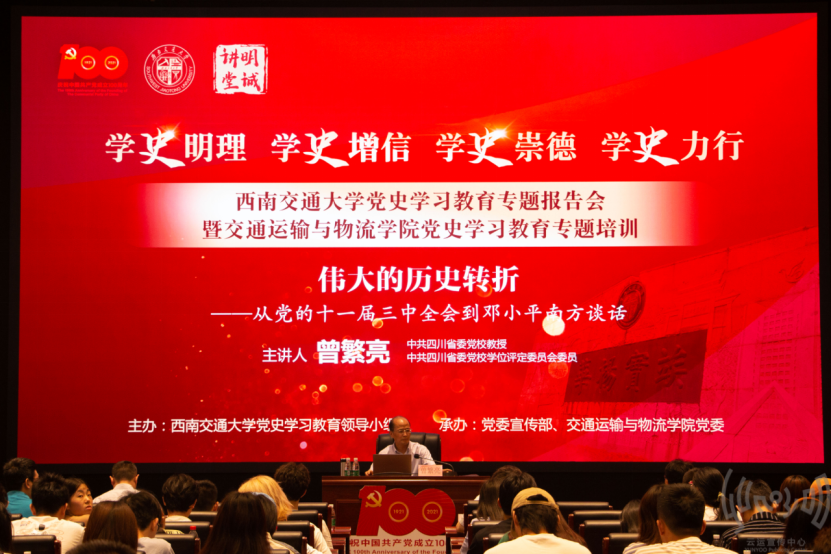 6月17日下午,437bwin必赢国际“明诚讲堂”党史学习教育专题报告会暨437bwin必赢国际党史学习教育专题培训在犀浦校区交运楼418报告厅举行。中共四川省委党校、中共四川省委党校学位评定委员会委员曾繁亮教授受邀作题为《伟大的历史转折——从党的十一届三中全会到邓小平南方谈话》专题报告。此次报告会由437bwin必赢国际党史学习教育领导小组主办,党委宣传部、437bwin必赢国际党委承办。公司党委甘灵书记,公司领导班子成员,党支部书记、师生党员代表200余人参加报告会。报告会由公司党委刘继宗副书记主持。