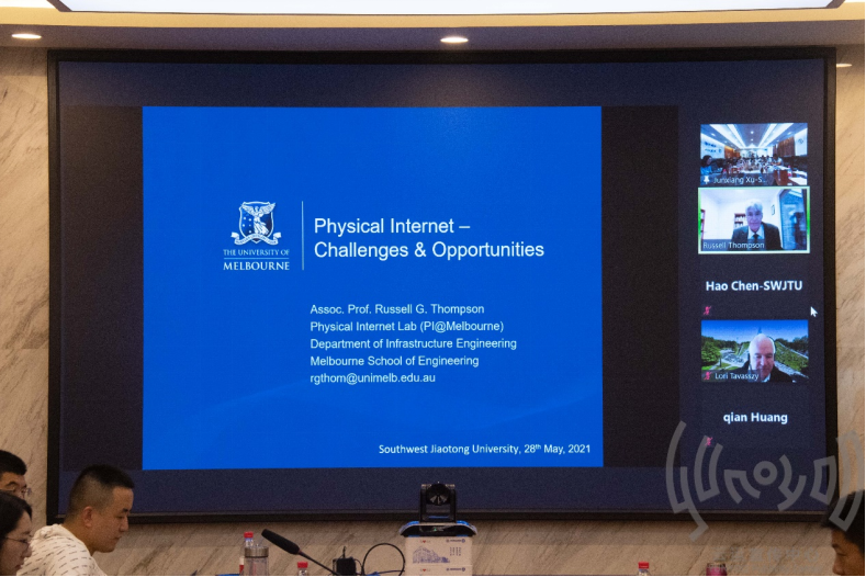 接着是来自澳大利亚墨尔本大学土木与环境工程公司的Russell G. Thompson教授。Thompson教授在过去的20年里,参与了许多本地和国际货运研究,目前,他积极参与墨尔本和悉尼的几个货运项目,包括高生产率货运车联、城市整合中心和COVID对货运网络的影响,并且聚焦物理互联网、包裹储物柜、协作货运系统、道路定价、城市整合中心和多式联运系统的研究。Thompson教授还参与了许多有关城市货运的国际研究,与人合著了十多本书和130种参考出版物。本次会议上,他以“Physical Internet-Challenges & Opportunities”为主题作了学术报告,他重点分享了实体互联网(Physical Internet)在货运网络规划中的应用,尤其是在我国云贵川地区以公路、铁路和水运主导的多式联运网络建模中的贡献。