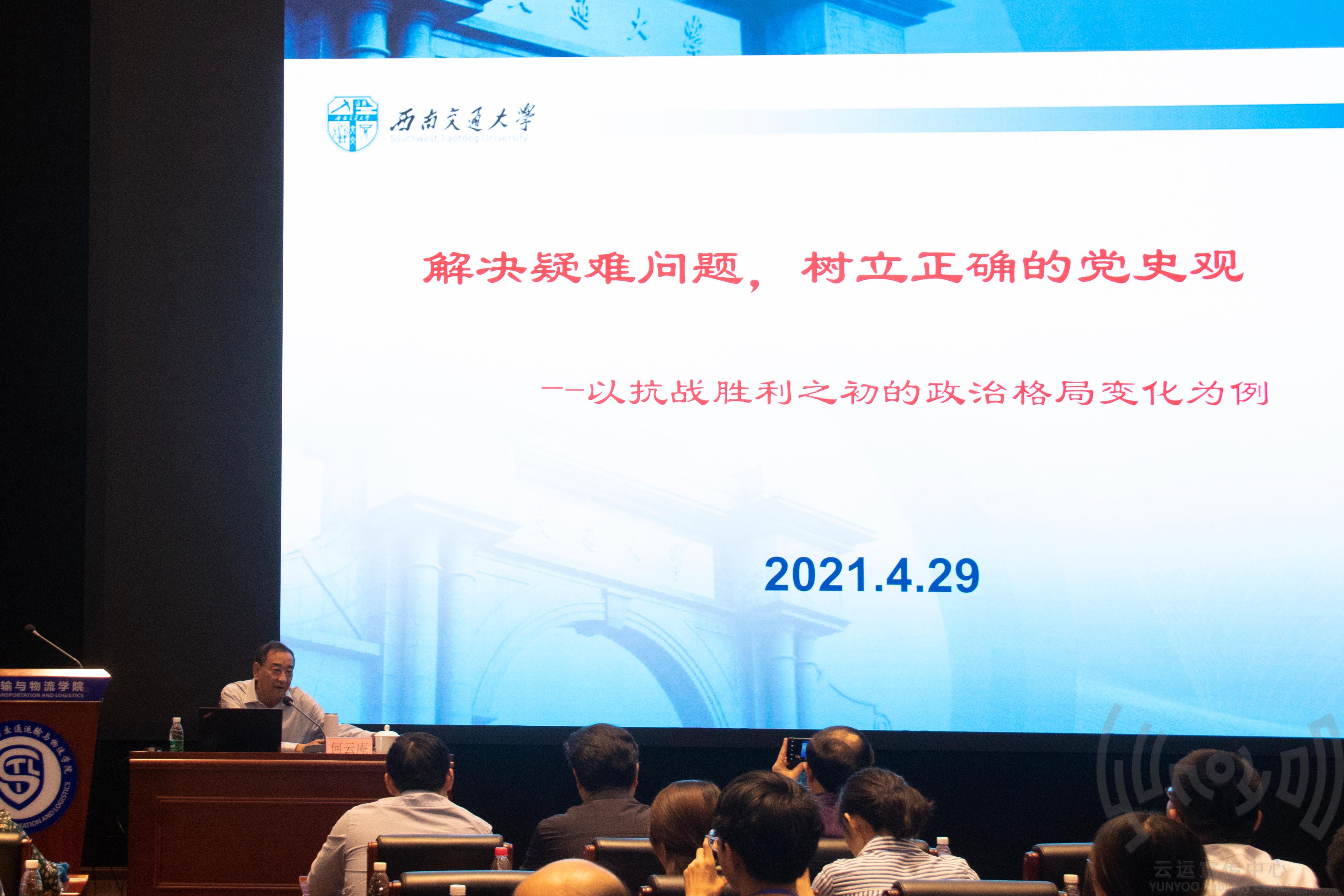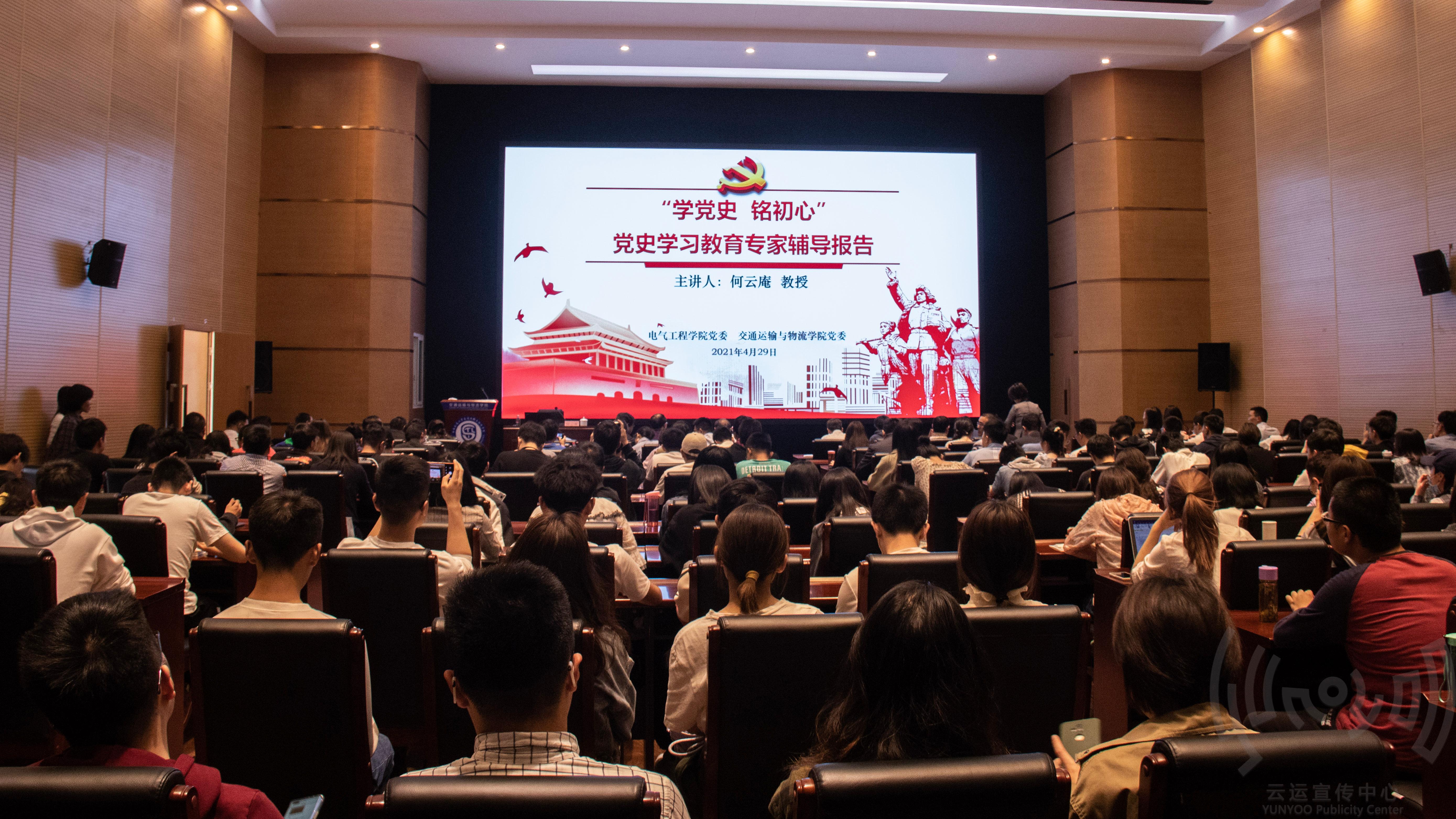 2021年4月29日下午,437bwin必赢国际党委与电气工程公司党委在交运楼联合举办“学党史,铭初心”党史学习教育专家辅导报告会,邀请公司马克思主义公司教授、四川省委宣讲团成员何云庵同志作“解决疑难问题,树立正确党史观”的专题报告。两个公司党员领导干部、党支部书记及部分师生党员共200余人参加了报告会。报告会由437bwin必赢国际党委书记甘灵主持。