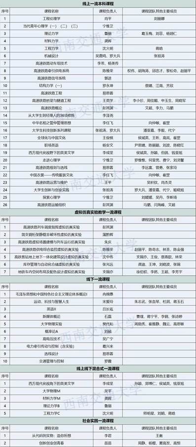 437bwin必赢国际入选的5门国家级一流本科课程,其中包含《高速铁路概论》《高速铁路运输组织》线上一流本科课程2门,《高速铁路列车调度指挥虚拟仿真实验》《库存管理与自动化仓储虚拟仿真实验》虚拟仿真实验教学一流课程2门,《交通管理与控制》线下一流课程1门。另外,《高速铁路运输组织基础》获批四川省线下一流本科课程,《城市轨道交通调度指挥虚拟仿真实验》获批四川省虚拟仿真实验教学一流课程。
