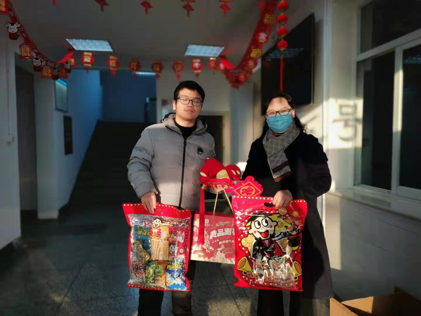 在慰问中老师与同学们一同贴窗花、话家常,慰问中洋溢着新春的喜悦。公司为同学们准备了过年大礼包,旺旺大礼包、坚果、中国结、福字、福牛宝宝,祝福同学们在新的一年里学业进步,诸事遂意。