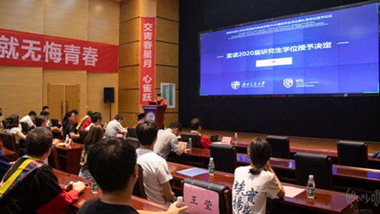 在全体庄严肃穆地奏唱国歌后,公司帅斌教授和李国芳副书记分别宣读了研究生学位授予决定和优秀毕业生表彰名单。“祝贺同学们圆满完成学业,这也意味着同学们老员工活的结束,昭示着新的人生历程的开始。”