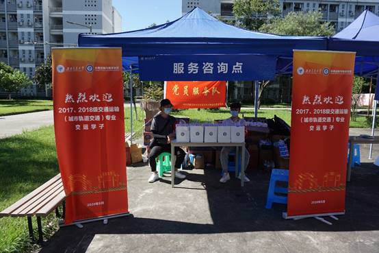 此次搬迁过程中,涉及城轨交运学子2个年级的7个班级,新宿舍分布在犀浦校区南北两个生活区。因此,公司在南北区均设有公司搬迁服务带点,由辅导员老师带领研究生党员服务队,为初到犀浦校区的同学们解答一些生活上的问题。同时,公司也为同学们发放精心准备的“搬迁大礼包”,礼包中有抽纸、花露水、交大书签、防疫手册、衣物除湿包等生活用品,为方便同学们入住新宿舍平稳过度。