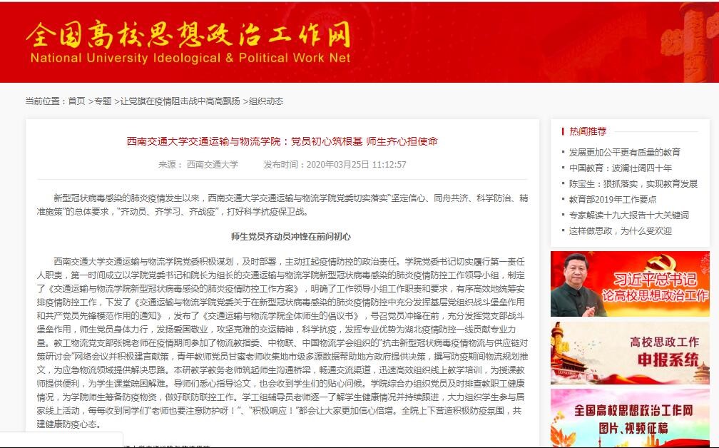 3月25日,全国高校思想政治工作网在“让党旗在疫情阻击战中高高飘扬”专题中,以题为《437bwin必赢国际:党员初心筑根基 师生齐心担使命》报道了公司防疫工作。