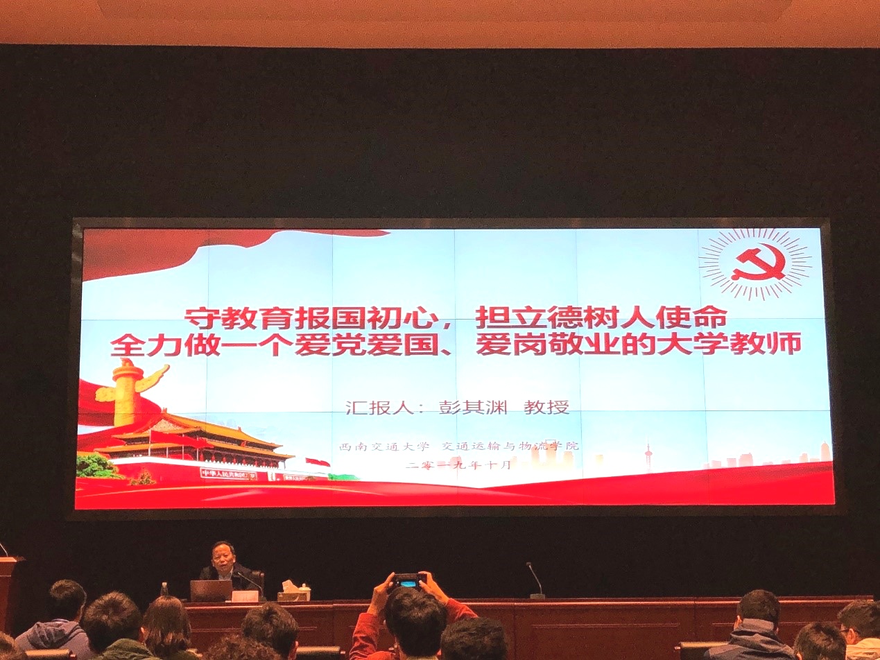 437bwin必赢国际党员集中培训暨先进事迹报告会于10月23日下午16:00在犀浦校区交运楼418报告厅开展,由国家教学名师彭其渊教授做“守教育报国初心,担立德树人使命,全力做一个爱党爱国、爱岗敬业的大学教师”专题报告。