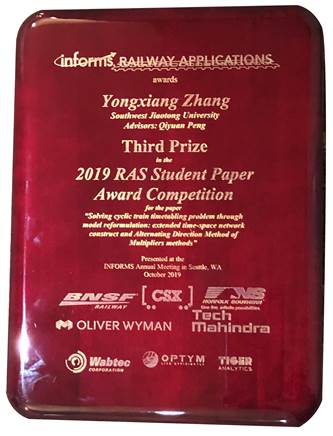 此外,博士生张永祥荣获本次INFORMS铁路应用学部(Railway Applications Section,简称RAS)员工论文竞赛(Student Paper Award)第三名,并在会上对获奖论文进行了主题演讲。据悉,INFORMS RAS员工论文竞赛自2002年至今已经举办了18届,每年都会面向全球高校研究生征集与铁路运输组织管理和优化相关的高水平学术论文,并由铁路研究领域的资深专家遴选出前三名进行颁奖。历届大部分的获奖论文随后都在《Transportation Research Part C: Emerging Technologies》、《Transportation Research Part B: Methodological》和《Transportation Science》等交通运输领域顶级刊物上经过严格同行评审后发表。