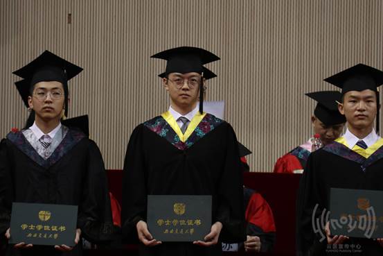 党委王顺洪书记,徐飞董事长为毕业生代表颁发学位证书,授学士礼。