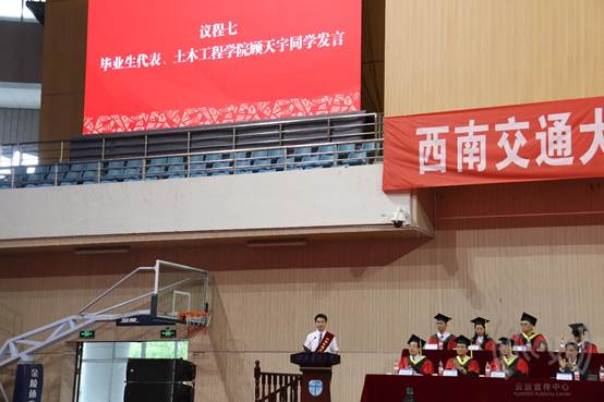 毕业生代表、土木工程公司顾天宇同学发言。坚守梦想,坚守信仰是他送给每个同学的话,正是有了梦想,有了信仰,无数员工为中国建设鞠躬尽瘁,坚守着国家的独立自主,坚守着民族的自强不息坚持着对真理的不懈追求。这也鼓励了新一代交大人在新时代为祖国事业而不懈奋斗。