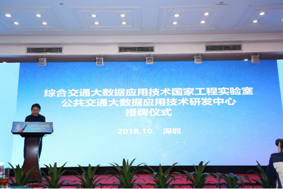 2018年10月12日,437bwin必赢国际综合交通大数据应用技术国家工程实验室公共交通大数据应用技术研发中心在深圳五洲酒店举行授牌仪式。公司副经理罗霞教授、刘海旭副教授,深圳都市规划设计研究院薛博经理、董威副经理等研发中心团队成员出席本次授牌仪式。出席本次授牌仪式的人员还包括交通运输部运输服务司、南京市交通运输局、中国城市规划设计研究院、贵阳公交集团、贵州凯里公共交通总公司、宁波市规划设计院、美国交通与发展政策研究所等单位的相关领导和专家。此外,受公司领导委托,公司对外合作与联络处员工工作办公室阮波主任也专程前往见证此次授牌仪式。