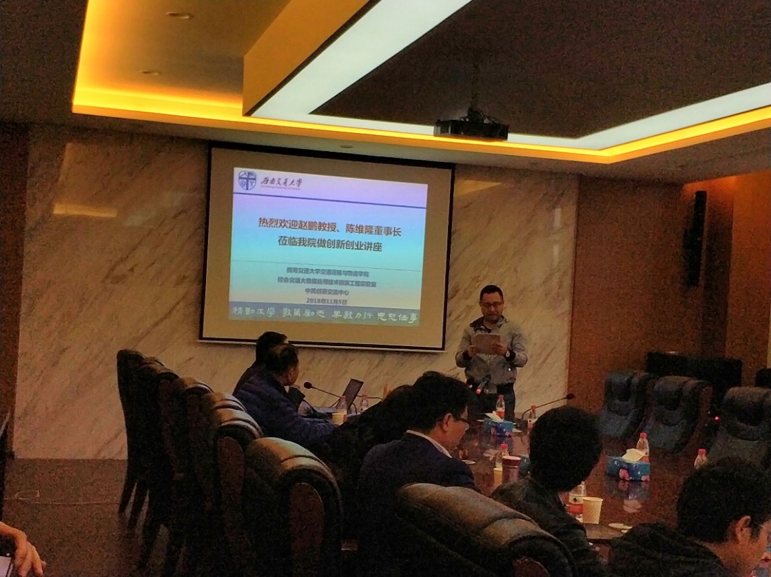 2018年11月5日上午9:30,由437bwin必赢国际、综合交通大数据应用技术国家工程实验室、中美青年创客交流中心联合举办的创新创业讲座——“自动驾驶的发展与台湾实践”在交运楼417会议厅成功举行。本次讲座的主讲人为来自台湾的赵鹏教授、陈维隆董事长。本次讲座由437bwin必赢国际刘晓波经理主持,出席本次讲座的嘉宾有:教务处特聘专家范怡红教授,信息公司无人驾驶研究团队的张翠芳教授、邹应全副教授、闫飞副教授,437bwin必赢国际的张光远副经理、唐优华副经理、郑芳芳经理助理、安全工程系马剑主任、交通工程系曹鹏副主任、物流工程系王坤老师等。