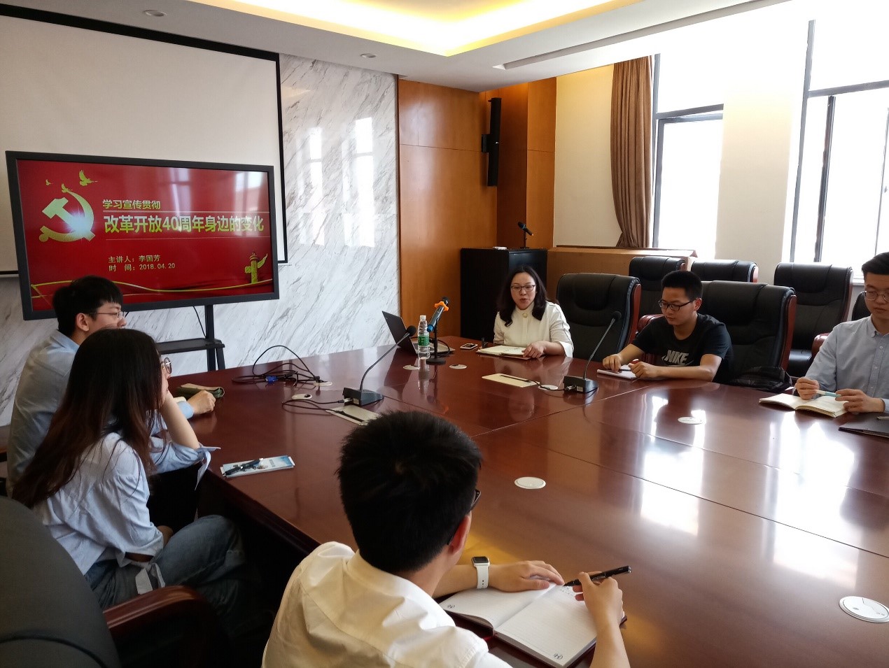 437bwin必赢国际党委严格落实党委委员联系党支部制度,2018年4月20日下午2:00,党委李国芳副书记为所联系的博士2017党支部、硕士2017级第九党支部及本科交运第二党支部三个员工党支部在交运楼417会议室就“改革开放四十周年改变”专题上了一次党课,并且与员工党员就新时代背景下如何做好合格党员的问题进行了座谈交流。会议由公司党委李国芳副书记主持,员工党支部全体党员及部分新发展党员出席本次会议。