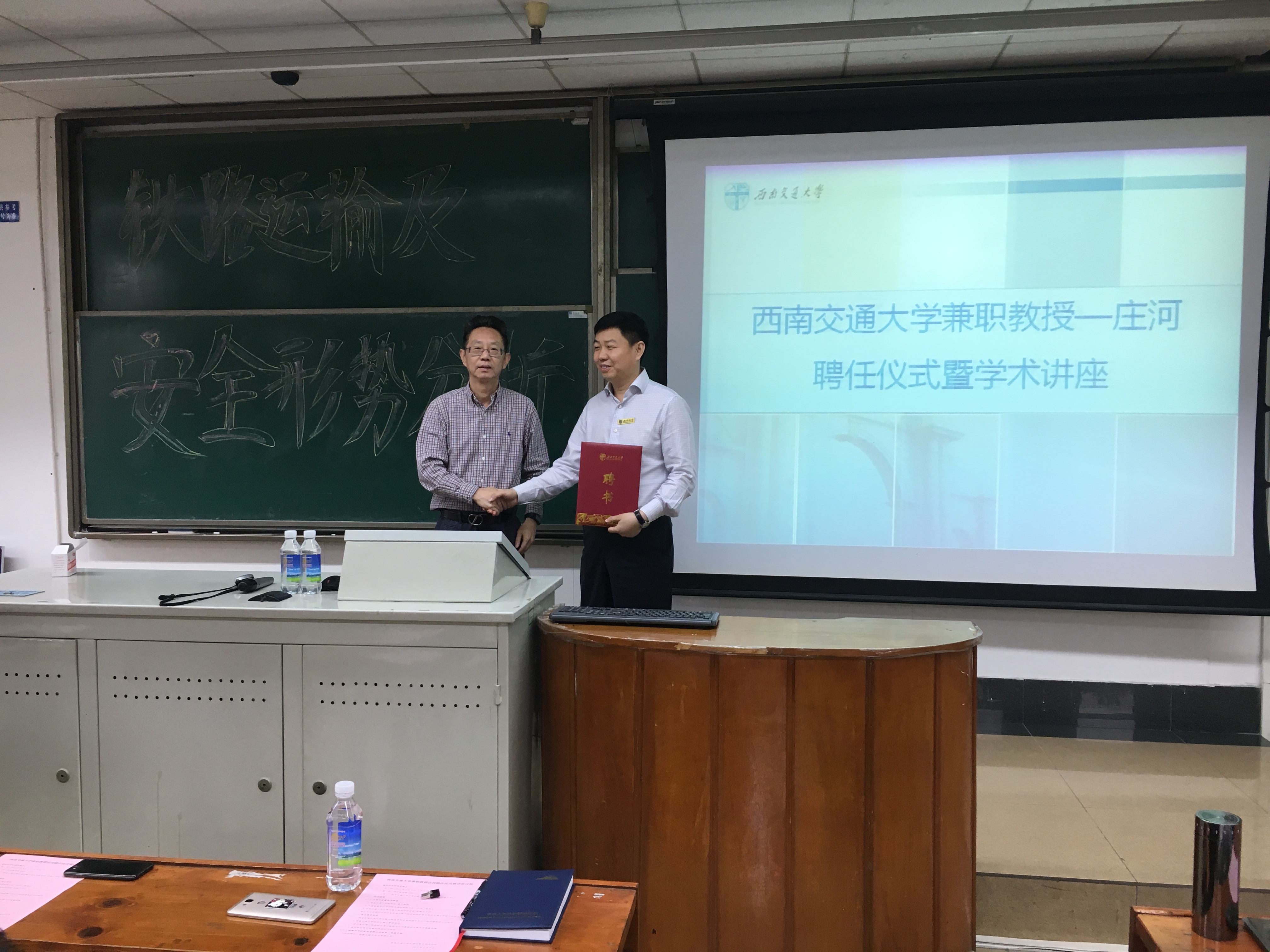 首先由郝建平书记对庄河教授进行简介,接下来,副董事长蒲云教授进行了讲话,并为庄河教授颁发聘书、佩戴校徽,他高度评价了庄河教授在铁路运输与安全领域所取得的成就,并对庄河教授长期以来对公司的关心和支持表示感谢。随后,庄河教授受邀讲话,庄教授表示作为交大学子,一直以来都为交大所取得的成就感到自豪,并愿意进一步加强与母校的交流与合作。