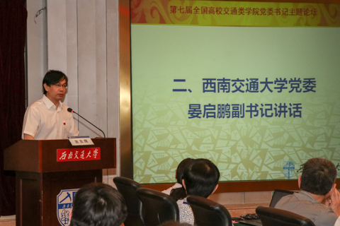 论坛开幕式最后,全国高校交通类公司党委书记论坛理事会理事长田新民书记讲话。田书记就本次主题论坛顺利开展发表了一个祝贺、两个感谢和三个希望。田书记祝贺本次论坛如期顺利召开;感谢437bwin必赢国际党委高度重视、职能部门大力支持、437bwin必赢国际精心筹办,感谢书记们能在百忙中抽空赴会;希望代表们在主题交流中积极献策,希望各公司尽心尽力、尽职尽责地珍惜呵护交通类公司党委书记交流平台,希望各公司传承西南交大的优良传统和作风,传达第七届全国高校交通类公司党委书记主题论坛的精神。