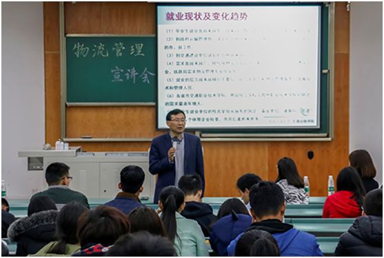 物流管理专业宣讲会邀请了公司物流学科带头人张锦教授、何娟老师、甘蜜老师、物流管理系郑海莎老师和张蓉蓉老师。张锦教授向同学们介绍了物流类学科在国内外的发展情况以及专业的研究方向和就业方向。何娟老师向同学们介绍了物流经济与金融方向的供应链金融,在政府政策与导向支持、现状与展望、市场参与方与岗位需求和人才培养方面逐一进行了系统性的分析。