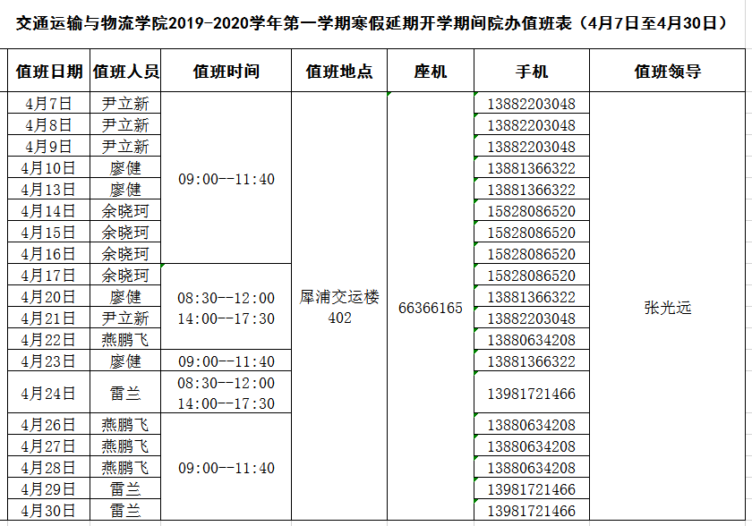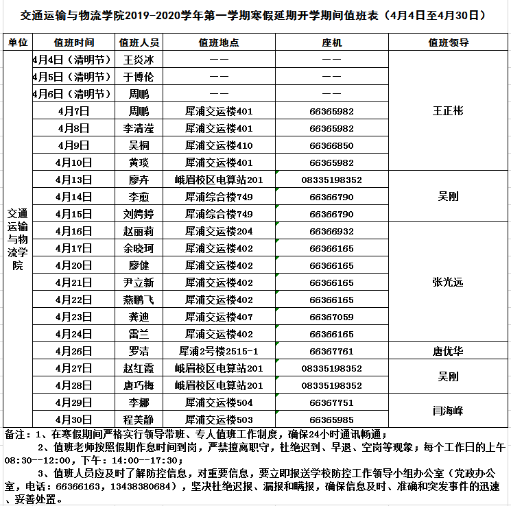 437bwin必赢国际2019-2020学年第一学期寒假延期开学期间值班表(4月4日-4月30日)