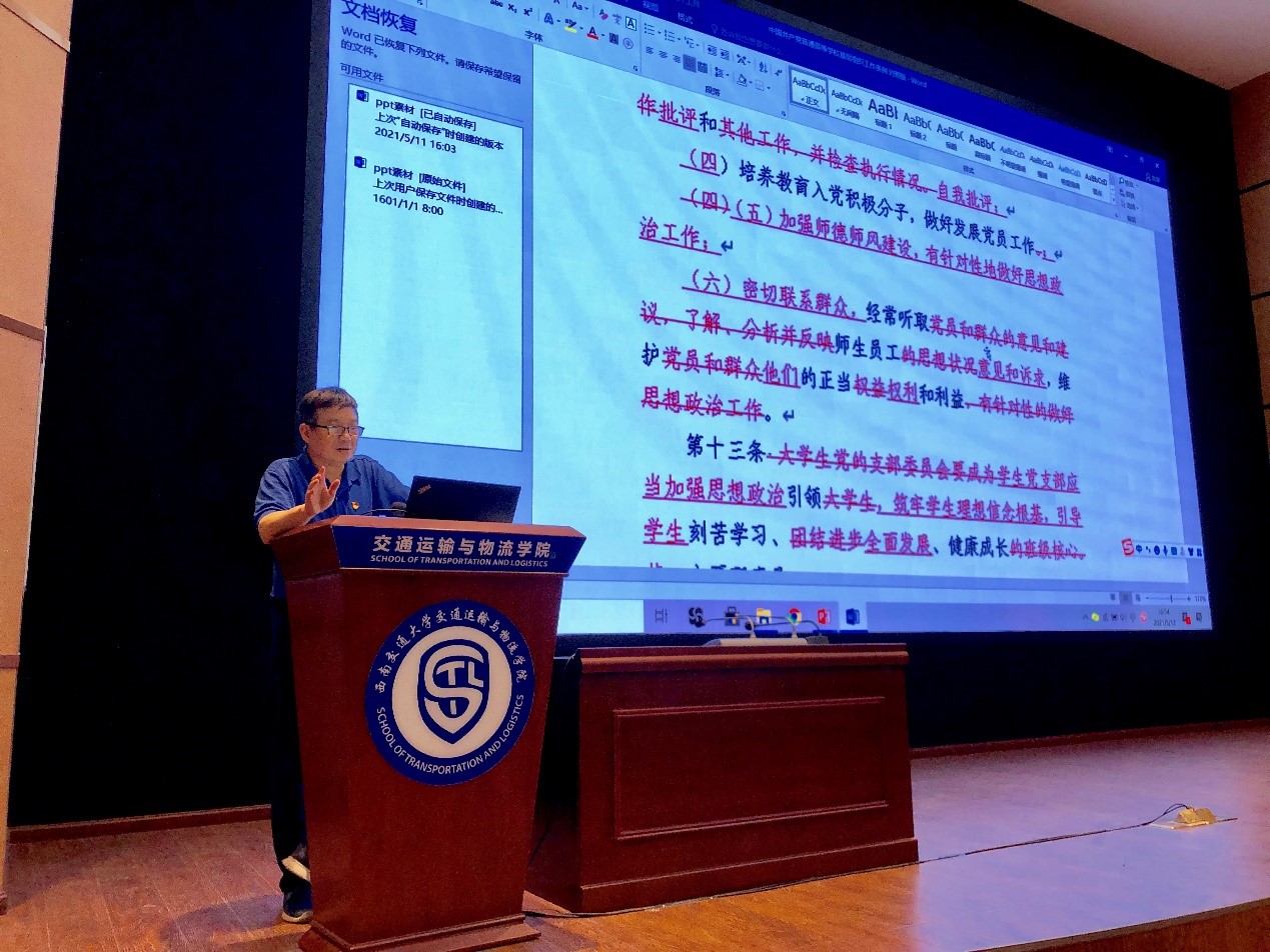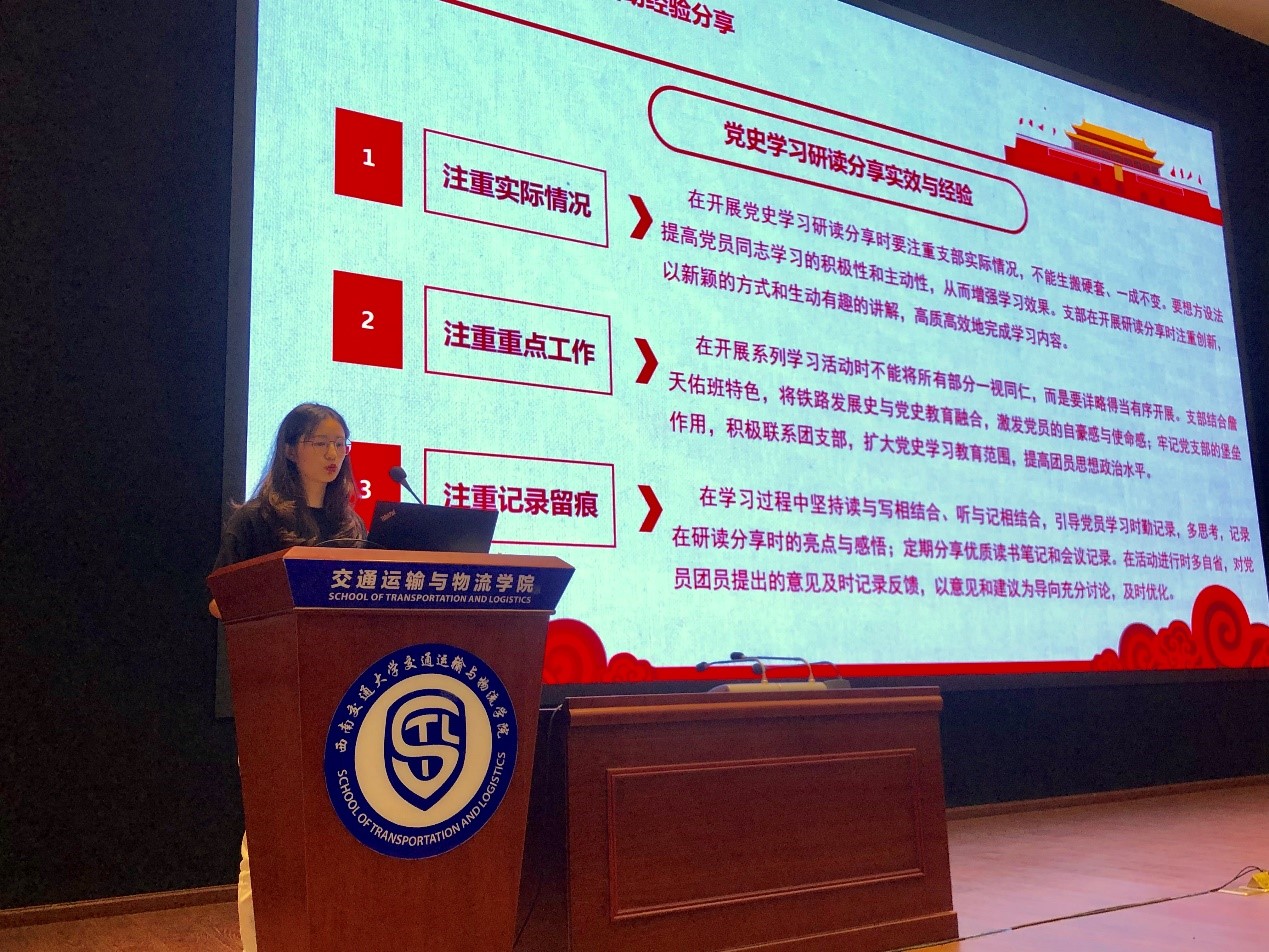 在论坛阶段,党支部书记博士2018级党支部书记罗洁从党支部学习教育的统筹安排、注重内容,集思广益、有效监督,因地制宜、投身实践,介绍了党史学习教育与支部日常工作有机融合的做法;硕士20级党支部书记怡智航分别从工作计划要提前、工作内容要全面、工作开展要严格、支委分工要明确分享了支部开展党史学习教育的具体做法;本科交运第四支部书记黄彦宁提出了党史学习教育“三创新”(学习内容、学习形式、学习方法创新)、“三结合”(党团结合、理论与实践结合、常规学习与专业特色结合)、“三注重”(注重实际情况、注重重点工作、注重记录留痕)进行分享。