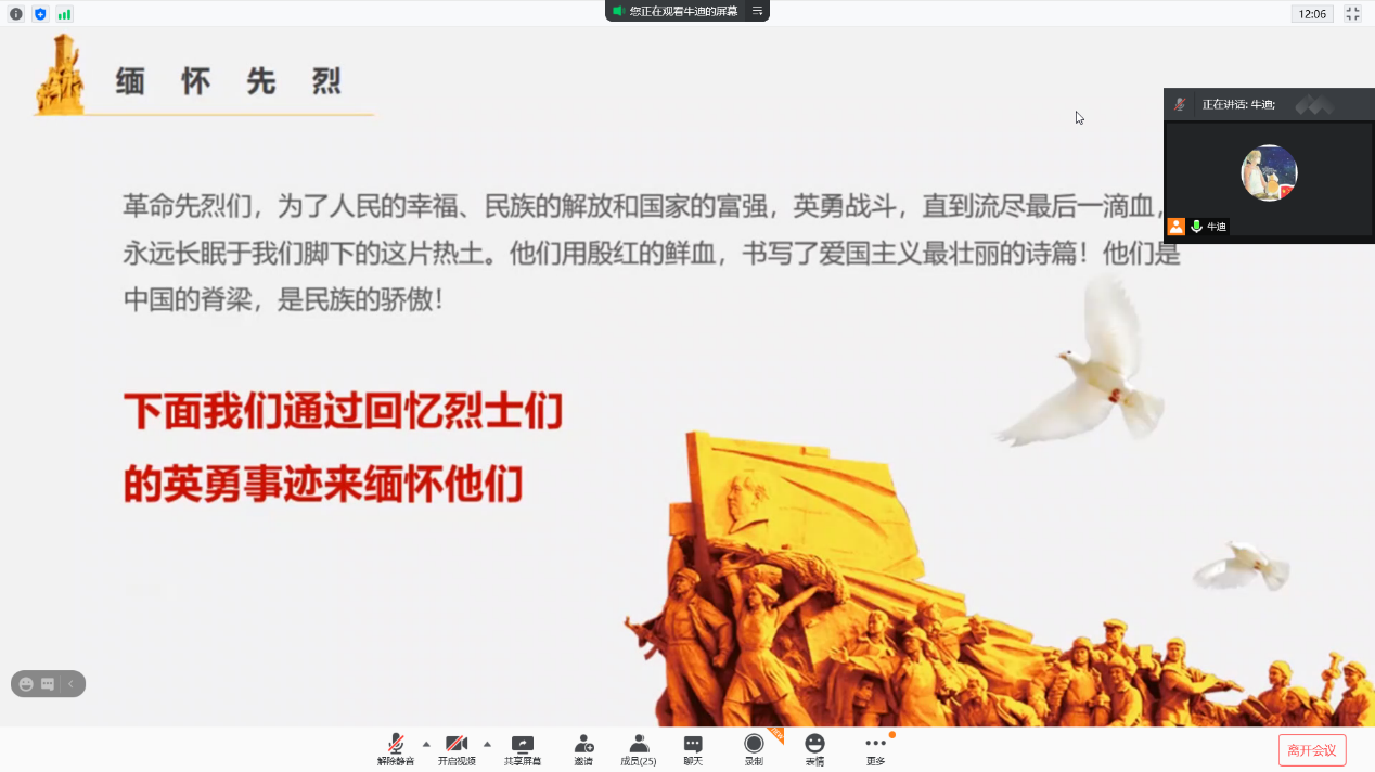 致敬英烈,应当从英烈精神中汲取爱国奋斗力量。牛迪同志说道:奉献是爱国的实质和力量,革命先烈满腔赤诚,无私奉献,用行动诠释了爱国主义精神的实质。我们要向英烈学习,怀揣一颗爱国的赤子之心,以顽强奋斗的实际行动诠释爱国主义精神。