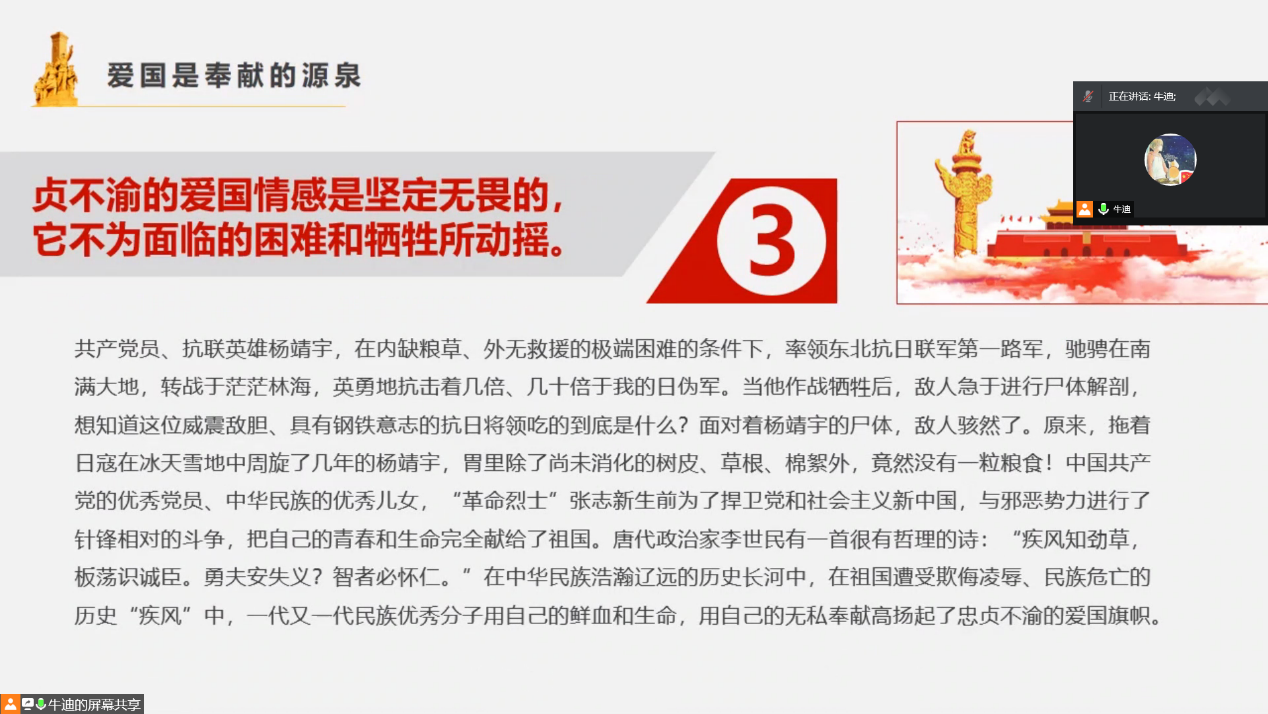 传承崇尚英雄的精神,关键还要讲好英雄故事。牛迪同志为支部党员同志分享了多位先烈的英雄事迹。黄继光用自己的身躯堵住了枪眼;董存瑞英勇炸碉堡,以生命为部队开辟了前进的道路;为了不暴露潜伏目标,邱少云任凭烈火烧焦身体也一动不动……牛迪同志动情地说道:保持先辈们的那么一种拼劲,那么一种革命热情,那么一腔爱国热血才是对先辈最好的缅怀和纪念。