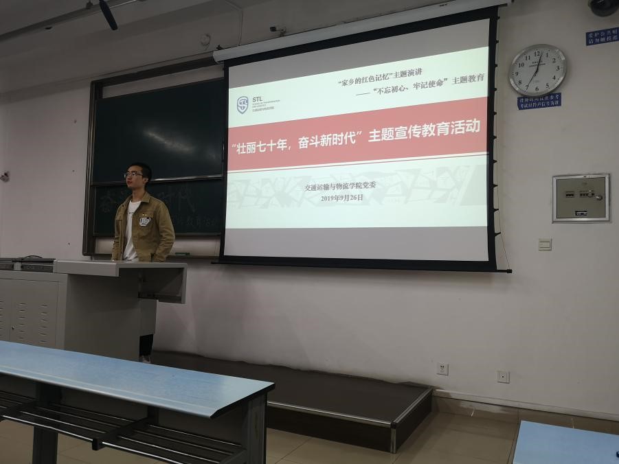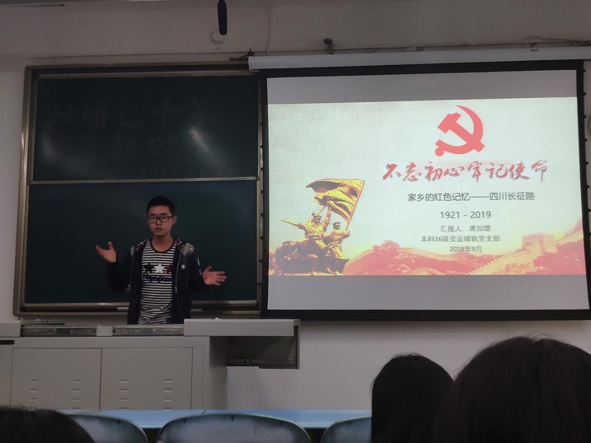 2019年9月26日晚19:00,437bwin必赢国际本科九个党支部于犀浦校区X2220联合开展“壮丽七十年,奋斗新时代”主题宣传教育活动。各个支部的代表以“家乡的红色记忆”为主题进行演讲,通过介绍自己家乡红色精神以及70年来的发展变化,让在座的每一个党员都感受到了自己的初心使命、见证了祖国70年来的伟大变迁。本次活动由本科交运第一党支部李冠辉同志主持。