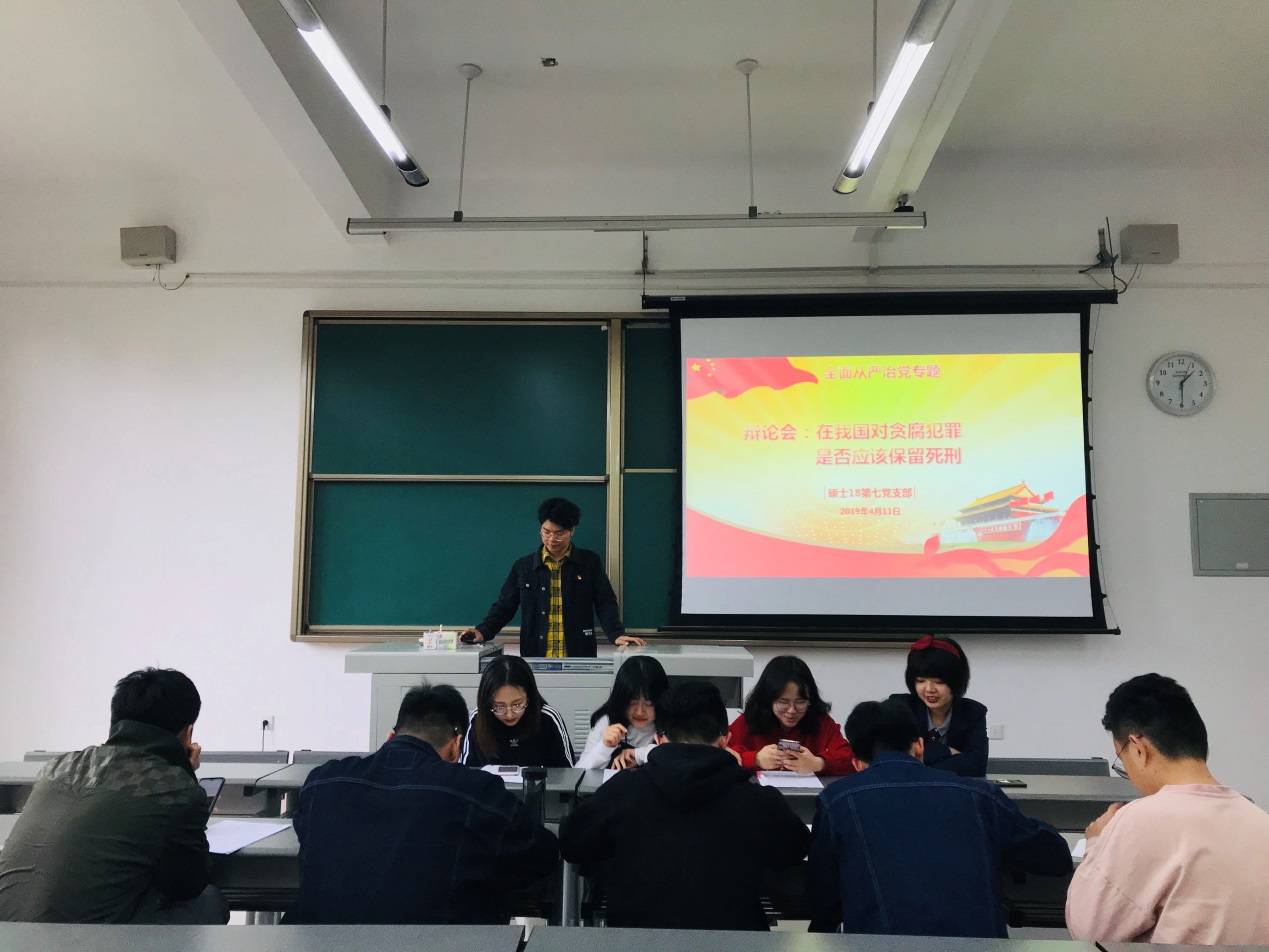 为深入学习习近平新时代中国特色社会主义思想和党的十九大精神,不断强化支部党员的思想武装,增强党支部活动的趣味性。2019年4月12日下午硕士18级第七党支部在X9201教室开展了“在我国对贪腐犯罪是否应该保留死刑”辩论赛活动。本次活动由第七党支部书记陈木泉同志主持。