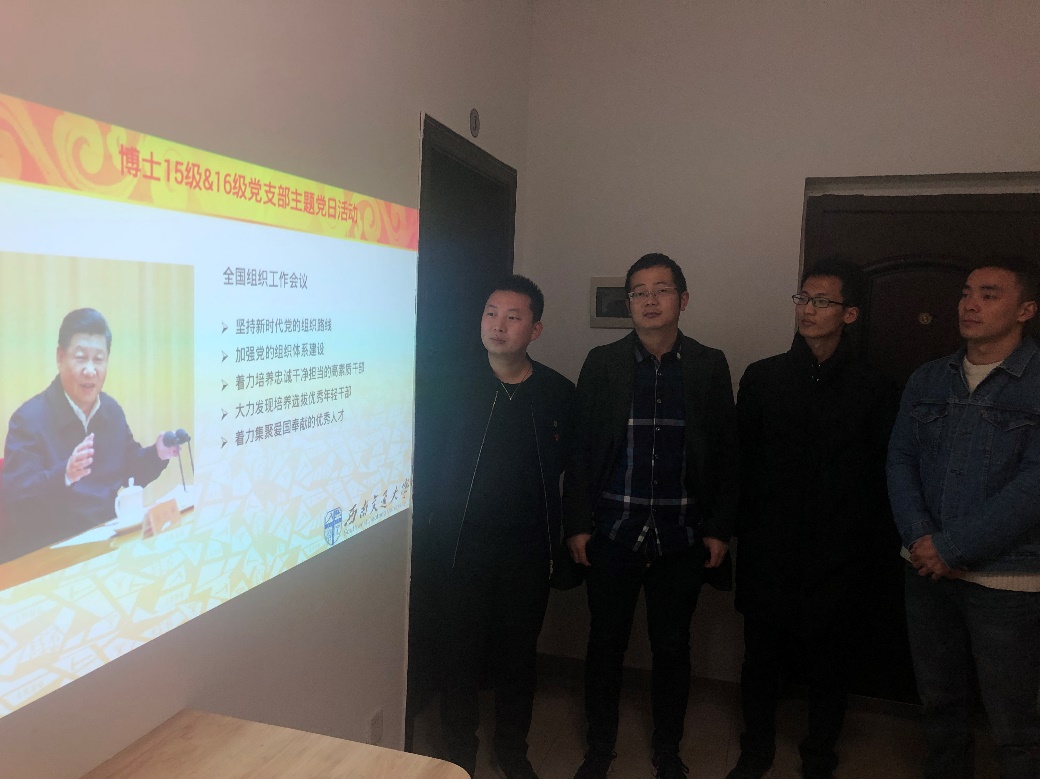 为了响应2018年全国组织工作会议的号召,2018年11月15日博士16级党支部在鸿哲斋8栋A204集中学习了习近平总书记在全国组织工作会议上重要讲话精神。本次活动由支部书记陈伟同志主持。