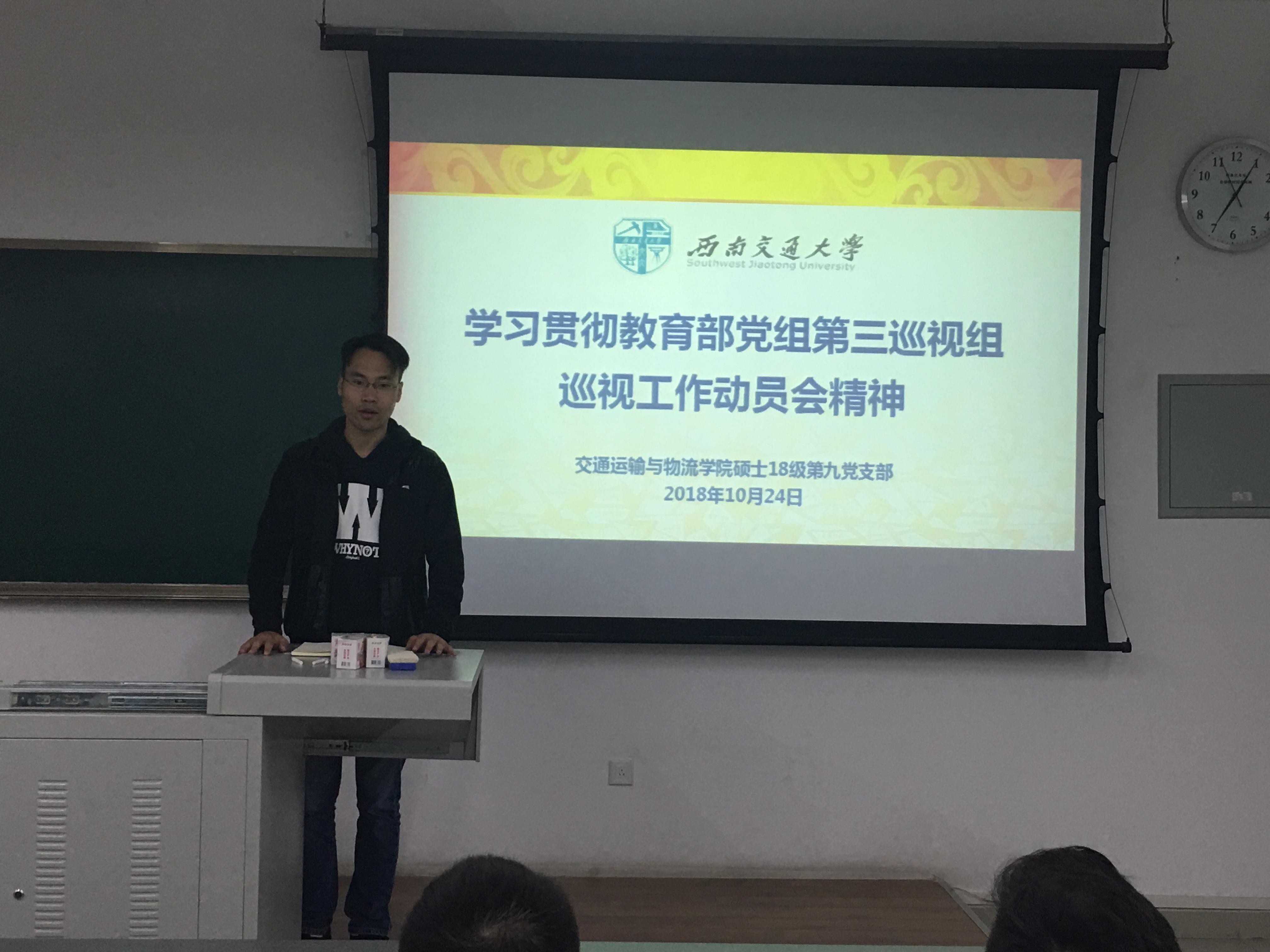 2018年10月24日19:00,437bwin必赢国际硕士18级第九党支部在X9206教室开展了组织生活会,专题学习贯彻教育部党组第三巡视组巡视工作动员会精神,会议由支部书记陈鹏同志主持。