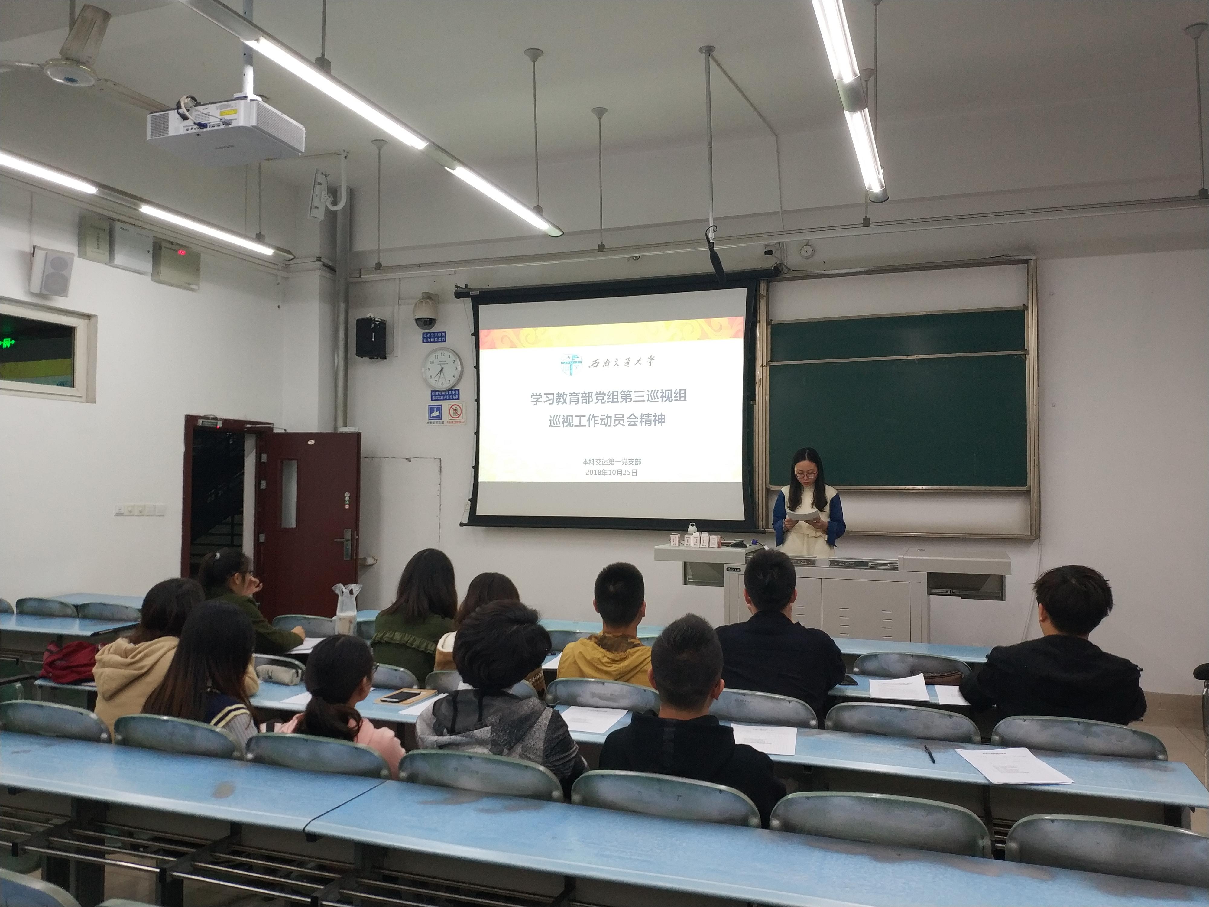 2018年10月25日19:30,本科交运第一党支部在犀浦校区X2331教室举办以“学习教育部党组第三巡视组巡视动员会上的动员讲话精神”为主题的党课,活动旨在充分认识巡视工作重要性,认真学习领会巡视组动员会讲话精神;支部各党员同志围绕主题展开分享讨论。活动由支部书记廖珮茹同志主持,本科交运第一党支部全体成员参加。