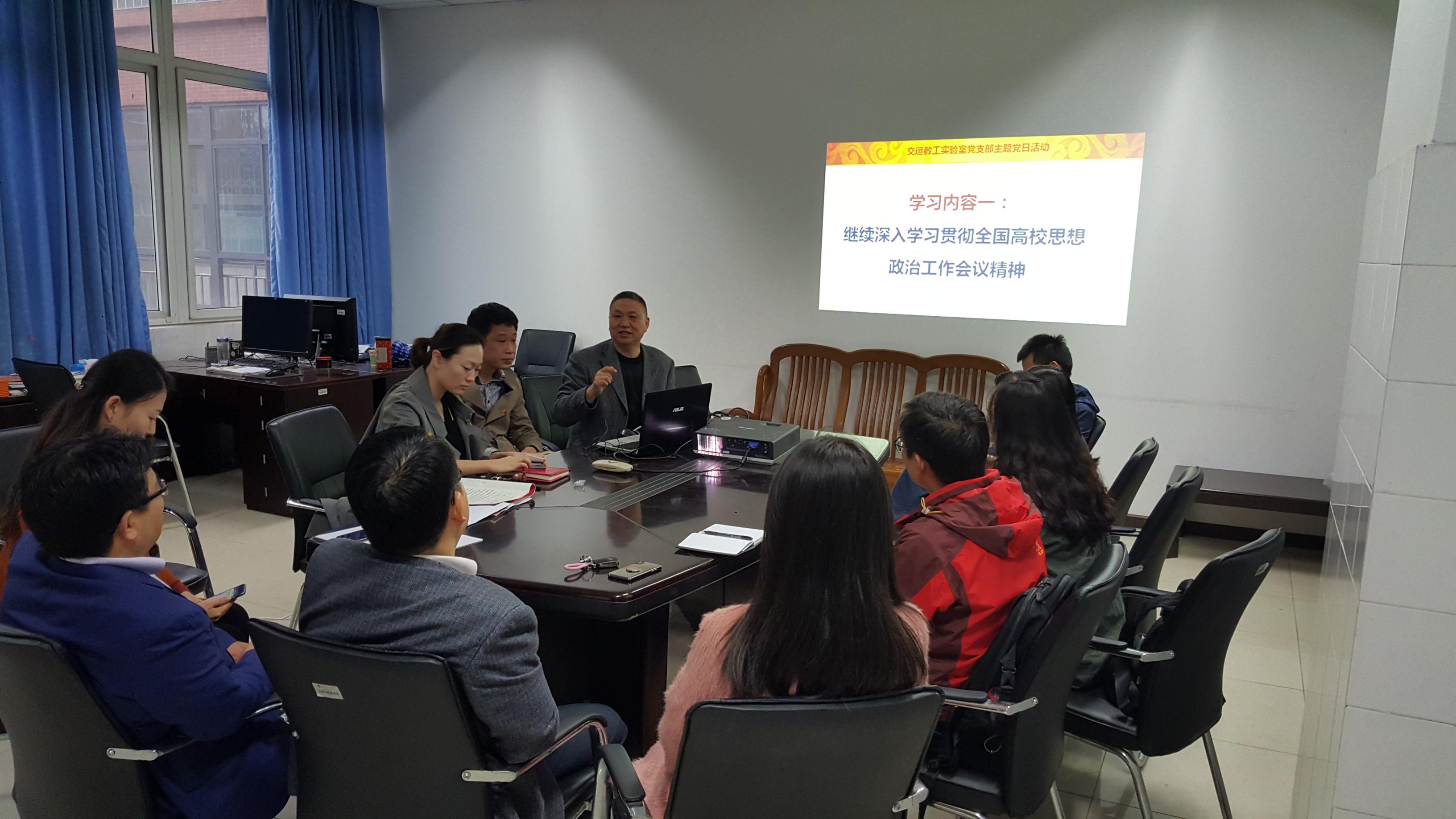10月18日下午4:00,交运教工实验室党支部在教学五号楼X5308开展“弘扬爱国奋斗精神、建功立业新时代”主题党日活动,活动内容为继续深入学习贯彻全国高校思想政治工作会议精神,学习《教育部关于印发< 新时代高校思想政治理论课教学工作基本要求>的通知》(教社科〔2018〕2号)和《中共教育部党组关于印发〈高校思想政治工作质量提升工程实施纲要〉的通知》(教党〔2017〕62号)两个文件精神。本次活动由支部书记邓灼志主持召开,并进行文件精读和主题报告,支部13名党员参加学习活动,达到支部党员总数三分之二以上。