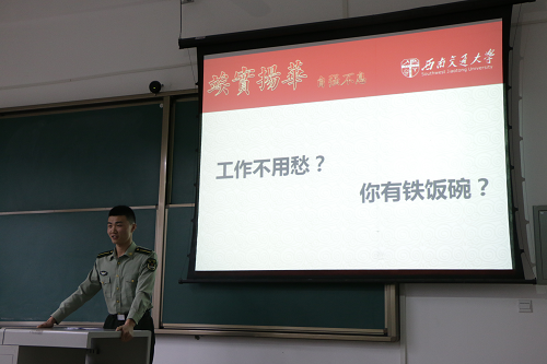 2014级国防生刘佳文学姐从生活与学习两个方面为学弟们分享了自己的大学时光。在学习方面,她告诉大家要先学会喜欢自己的专业才可以学好自己的专业,同时在课余时间还要积极参加科创竞赛,培养自己的兴趣爱好,提高独立思考和自学能力;在生活方面,她为大家分享了自己在军校失利进入西南交大茅以升公司以及后来成为西南交大一名国防生的路程,告诉大家要学会坚持也要学会放弃。