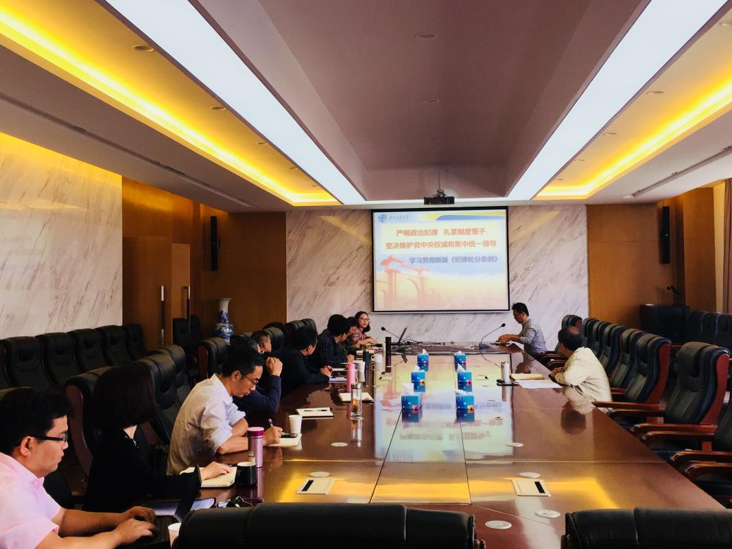 2018年9月26日上午9:00,在犀浦校区交运楼417会议室召开了437bwin必赢国际党政联席会暨党委中心组学习会议,会议分成两个部分,第一部分党政班子就一体化等相关工作做了研讨和商议,第二部分主要由公司党委副书记兼纪委书记李国芳同志以《严明政治纪律,扎紧制度笼子,坚决维护党中央权威和集中统一领导》为题,带领大家学习了最新修订后的《中国共产党纪律处分条例》(以下简称《条例》)。李书记带领大家回顾自首次印发以来《条例》历次的修订情况,向大家详细解读本次《条例》修订的主要内容,以及修订内容的重要特征。她强调,最新修订的《条例》的一个鲜明特点就是突出政治性,把坚决维护党中央权威和集中统一领导作为出发点和落脚点。此外,李书记还结合《条例》内容就公司、公司层面的纪委工作为大家进行讲解,使大家进一步了解纪委的工作内容和工作流程。