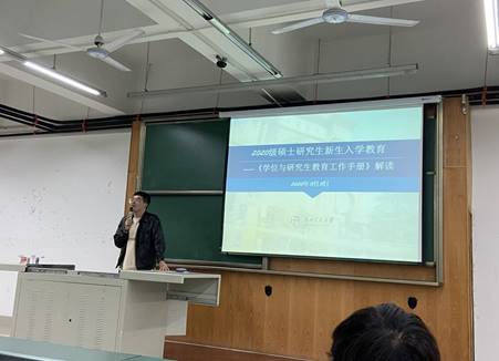 接下来,黄琰老师展开了研究生阶段的日常行为规范及安全教育,对员工的权利与义务、研究生奖助与荣誉称号、研究生学籍管理规定、请销假制度以及各项明令禁止的行为进行了介绍,让同学们对研究生生活的各个方面都有了进一步的了解。