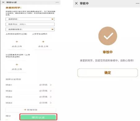 (二)进入信息申报页面后,仔细填报公司、院系专业、教育层次等信息;上传身份证照片(正面)、员工证照片、认证基准条件证明;在选择认证项目中,根据下拉菜单逐级选择条件符合的认证项目,并上传相应的照片。当选择认证项目在思想政治、社会实践、创新创业、专业学习,成长锻炼,文体活动、技能特长7个类别中满足4个类别取得计分,同时满足专科生总分数达到18分(含18分)以上,本科生和研究生总分数达到24分(含24分)以上条件后,点击下方“提交认证”按钮即可完成申报,将出现“审核中”的页面。