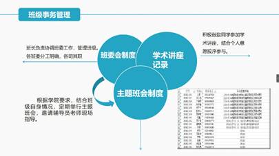接下来是硕士18级5班班长曹许漾从班级概况、思想建设、学风建设、文化建设以及班级事务管理5个方面进行分享,他着重介绍了通过制定班委会制度、主题班会制度以及学术讲座记录来完善班级事务管理的班级制度。