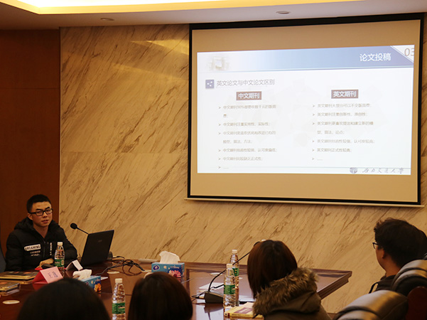 随后,李祥尘同学为大家分享了学术信息检索与国际论文发表的学习心得。他从论文方向选择与突破点寻找、文献哪里找、文献怎么读、学术论文的基本结构(问题描述,文献综述,方法,结果分析与讨论等几大难点)、论文投刊等方面为大家分享许多十分有价值的经验。