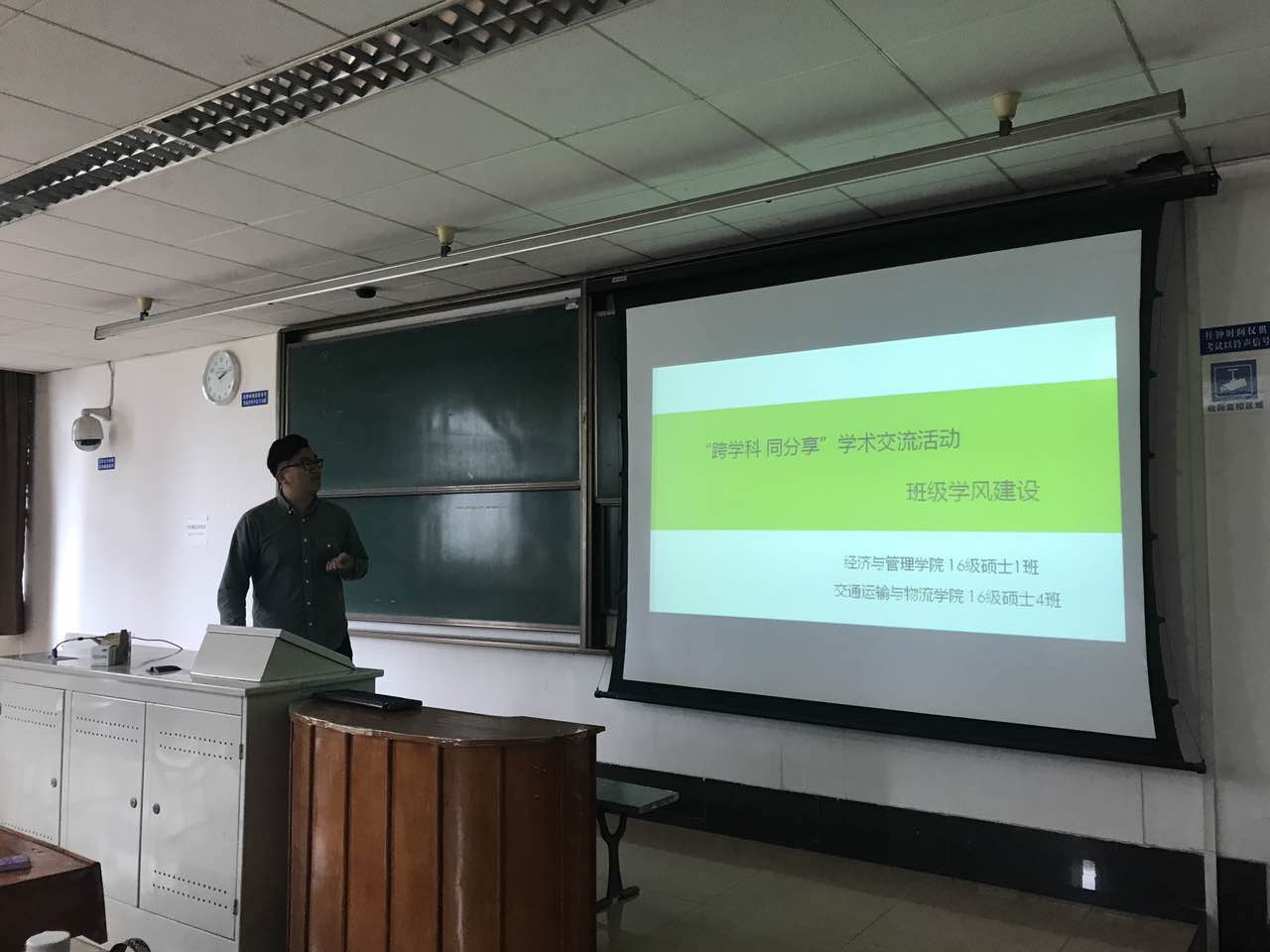 首先,两位班长分别对班级情况进行了简要介绍。随后,由各班同学代表从各自的专业出发,根据自身学术研究方向,进行了简要的主题报告。首先由交运4班团支书赵美怡同学进行分享,她以“交通运输业与国民经济关系的数量分析”为题,从交通运输学科的专业知识背景出发,由浅入深进行了介绍。接下来经管公司硕士1班的景兰同学以四川省为例,介绍了人口迁移与区域经济发展的关系。最后由刘杰同学以自己即将发表的论文“铁路网络的抗毁性分析研究”为引,对论文内容做了简要介绍,并着重分享了自己在论文构思、论文撰写、论文投递发表过程中的经验与收获。
