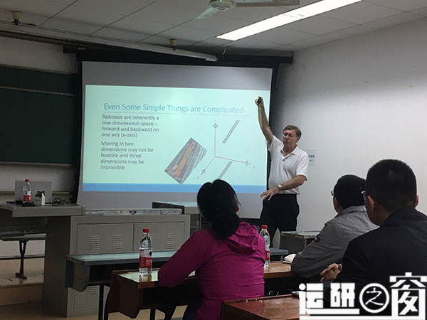 讲座中Roger Baugher教授主要结合实际案例对美国铁路系统运作方式进行了介绍,并希望大家能将其与中国铁路系统进行对比,发现不同铁路系统的优势和不足。在对驼峰的探讨中,Roger Baugher教授主要从列车进入车场时间、到达列车的股道选择、列车离开时间等问题进行了详细地介绍。此外,Roger Baugher教授还谈到了运筹学在铁路系统中的运用和运筹学最近的发展趋势等问题。