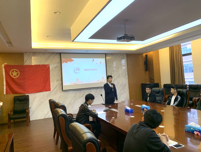 在宣誓仪式完成后,新团员代表王彬旭进行了发言,首先他表示能成为一名优秀的共青团员,心中充满了自豪感和光荣感,并讲述了五四运动的伟大意义,以及他眼中的五四运动,在最后他谈到了由于一代代先辈的积淀,从来没有哪一代青年比我们更接近中华民族伟大复兴这个目标,而我们只要按照习总书记对于青年人的六点要求去不断努力,奋斗,为我们的后辈创造更好的条件,实现中华民族伟大复兴的中国梦。随后,优秀团员代表蔺博学进行了发言。首先他代表老团员们对新团员的加入表示热烈的欢迎,并认为中国共青团的队伍将因此得到进一步的壮大,之后他谈到了作为一名共青团员的责任与义务,最后他再次对新入团团员表示了欢迎,并希望他们在生活中能发挥共青团员的先进作用。