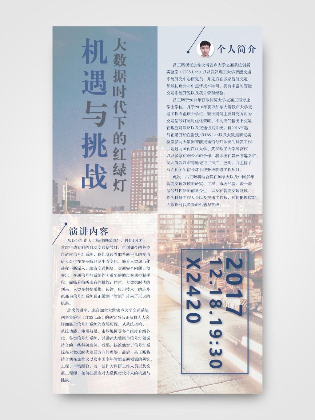 此次,吕正旸将结合其在加拿大以及中国多年智能交通领域的研究、工程、市场经验,谈一谈信号灯控制的前世今生,以及在智能交通领域,作为科研工作人员以及交通工程师,如何把握应对大数据时代带来的机遇与挑战。