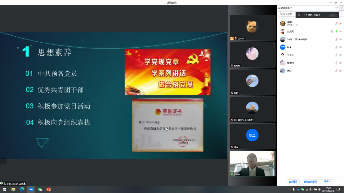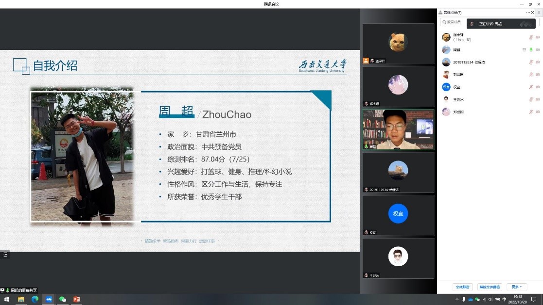 本着展示詹班建设情况和优秀学子风采,增加各年级詹天佑班同学之间的互动和交流的初衷,在天佑铁道公司的支持下,10月20日晚437bwin必赢国际2022年度詹天佑班优秀员工评选顺利进行。437bwin必赢国际员工工作组王炎冰老师、权宜老师、温宇轩老师出席此次会议。经前期报名与资格审核,共4位同学进入到最终答辩环节。