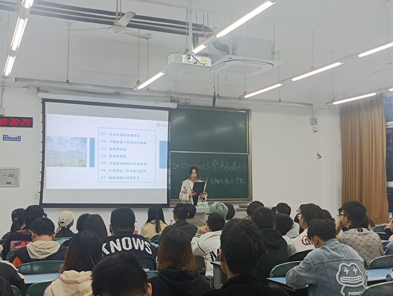 会议第四项议程,鼓励各班权益委员和同学们进行沟通,了解同学们的诉求,积极提交提案。权益部会在收到提案后进行实地考察,积极解决问题,最后在有效时间内进行回复,同时也与各班权益委员积极联系沟通,共同维护同学们的权益。紧接着,就“什么为有效提案”“有效提案的注意事项”等问题进行悉数解读,并对以往权益工作进行总结回顾。