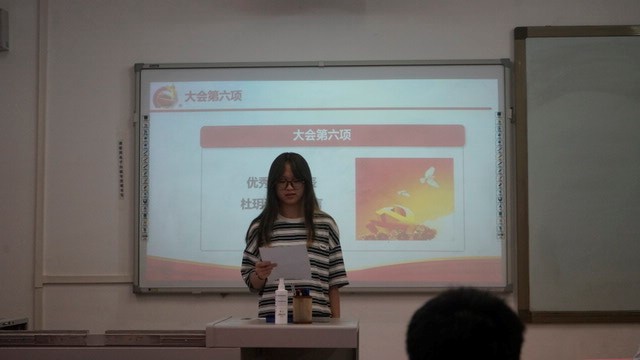 随后,优秀团员代表杜玥沅进行了发言。首先她代表老团员们对新团员的加入表示热烈的欢迎,并认为中国共青团的队伍将因此得到进一步壮大,她表示作为一名共青团员,要积极履行责任与义务,并希望他们在学习生活中能发挥共青团员的先进作用。