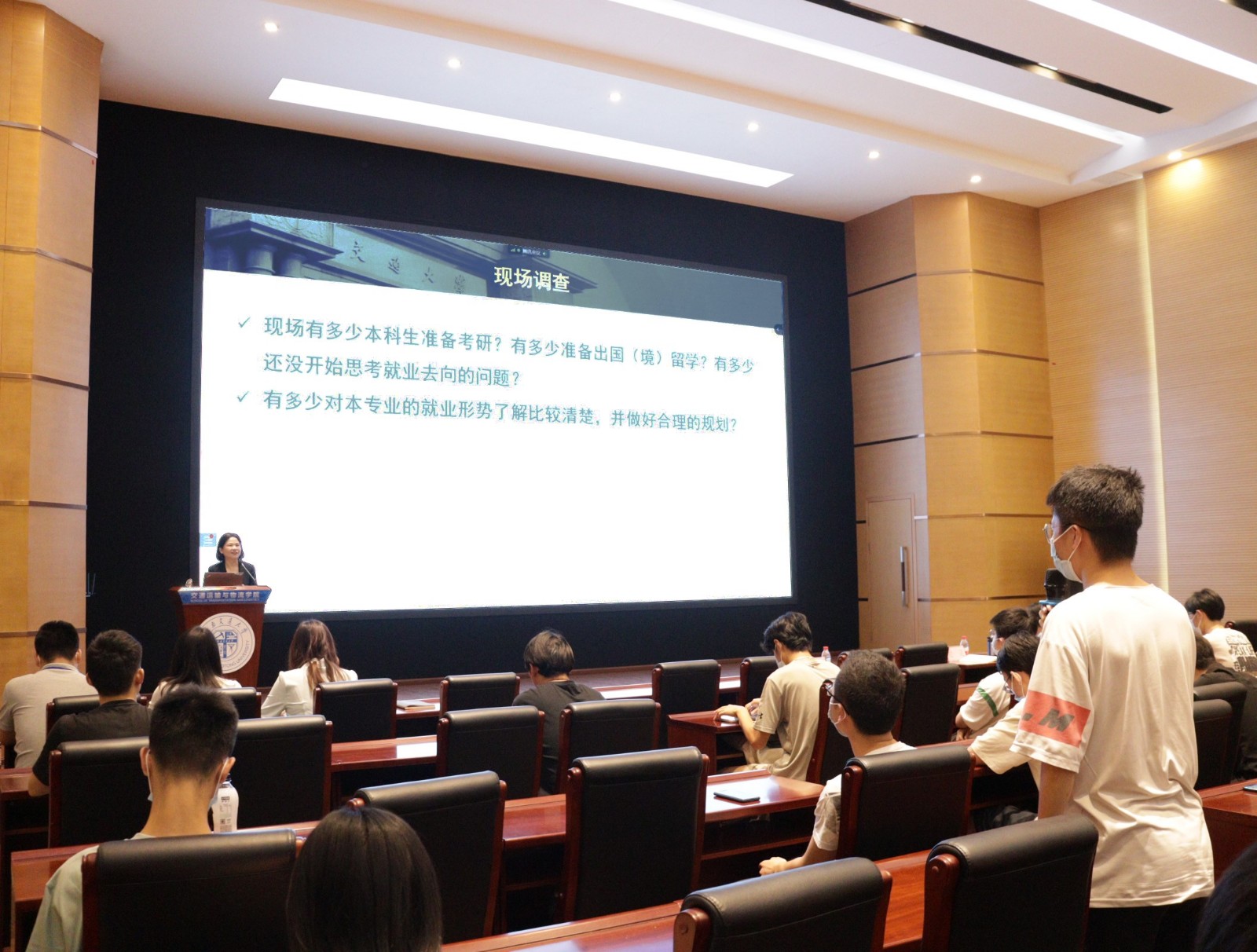 会议伊始,437bwin必赢国际人才招聘处黄春蓉老师结合2022届毕业生考研升学和签约就业的整体情况,引导2023届毕业生做好职业生涯规划工作。对此,黄春蓉老师根据老员工就业的新趋势,结合往届毕业生就业情况的具体事例,提出在找工作时要把握整体局势、科学合理定位、切勿心气过高的宝贵建议。同时,黄春蓉老师也告诉大家“考研不是唯一出路”、“选择比努力更重要”,并希望同学们能够明确奋斗目标,做好职业规划,理性看待考研,把握机会,奋力拼搏。