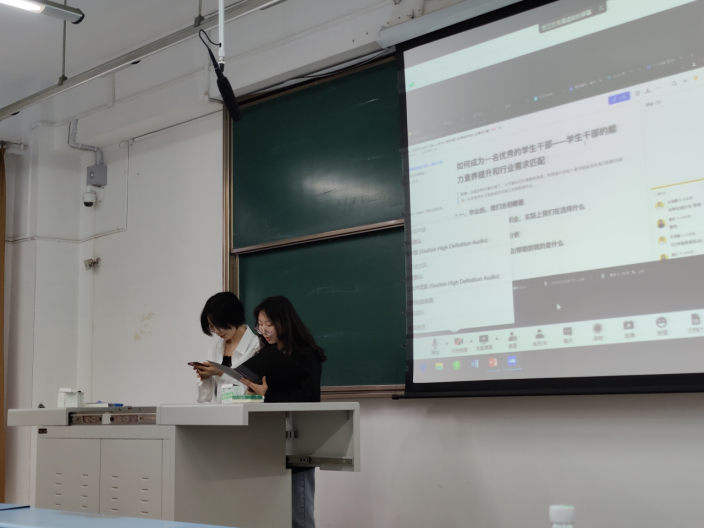 交流会伊始,温如向同学们介绍了毕业后就业的选择。接着,温如讲述了自己对于就业方法论的思考。她告诉同学们要珍惜时光,把握机会,去探索尝试不同的选择。温如也向到场的同学们分享了发掘自己潜能的小技巧。面对别人的评价,温如认为同学们要学会用辨证思维看待评价。随后,温如指导了同学们做职业定位分析的方法,为自己的职业能力做出有效评估,并参考市场现状了解职业行情。讲座最后,温如向同学们分享了自己在大学的员工社团工作时的经历和收获。