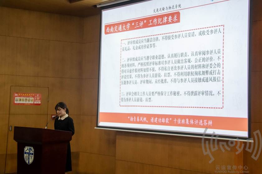 介绍完出席评委后,由主持人宣读评审工作纪律要求与“十佳班级体评选方法。