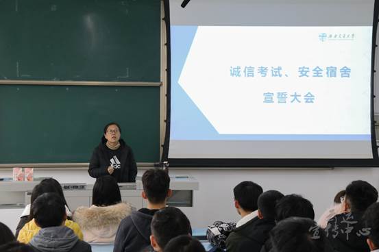 2018年12月19日上午11:40,面向2018级本科新生的“诚信考试 安全宿舍”宣誓大会在X2429顺利举办。会议由员工工作组副组长张素风老师和2018级辅导员甘升碧老师担任主讲人,2018级辅导员薄琳老师主持。