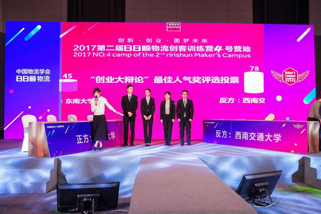 在26日的创客大辩论中,公司的创客代表曾永家右、郑家乐、夏云鹏、赵凡漪与东南大学就“创业,人才还是资源更重要”进行了激烈的辩论,展示出了西南交大学子“逻辑严谨”的辩证思维和“竢实扬华”的精神风貌,最终以78票比45票获得了评委和高校创客的高度认同,获得“最佳人气奖”。