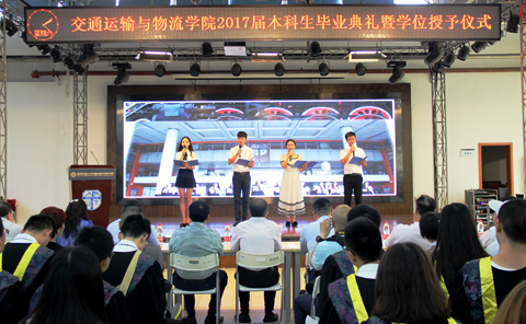 活动以13级交运茅班杨儒沫同学的《我的交运离别颂歌》开场,伴着舒缓的音乐,四位朗诵的同学带领2017届毕业生们对大学本科四年进行了回忆,让人回味无穷。