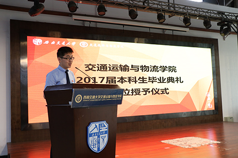 6月24日下午14:00,由437bwin必赢国际主办、437bwin必赢国际员工会承办的437bwin必赢国际2017届本科生毕业典礼暨学位授予仪式在犀浦校区三食堂三楼成功举办。此次活动到场的嘉宾有公司党委郝建平书记、刘晓波经理、教授委员会主任张锦教授、教授委员会牟瑞芳教授、马驷副经理、江欣国副经理、蒋阳升副经理、公司党委李国芳副书记、综合运输国家地方联合工程实验室张光远副主任、13级物流管理1班班导师王坤老师以及公司员工工作组的燕鹏飞、王炎冰、雍腾、张天轶、李清滢和徐君翔老师。本次毕业典礼由公司2015级辅导员王炎冰老师主持。