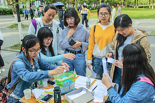 早上10:00,天朗气清,活动正式开始,同学们热情饱满,参与度极高。中午12:00,活动到达高潮,现场人声鼎沸,同学们穿梭在几个答题点间,热闹非凡。一些同学拿着积分兑换自己的奖品,沉浸在一派欢乐的氛围中。